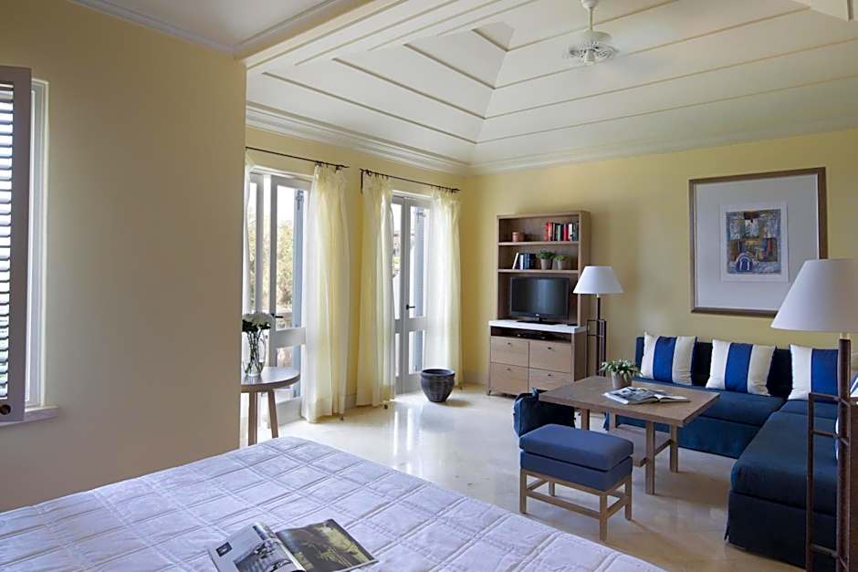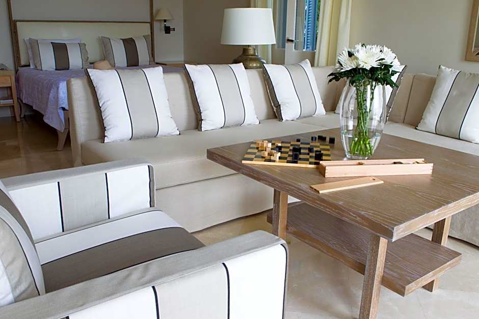 These suites can be found in both the main building and in individual residences within the gardens. With a very comfortable lounge area and a view to the sea, they feel spacious and airy, aided by cool marble floors, stylish Mediterranean furnishings and louvered doors.
